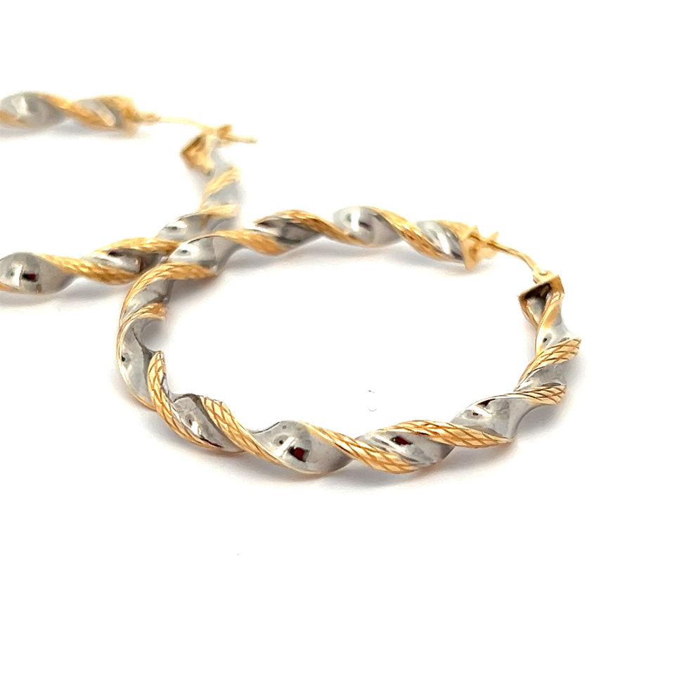 - イエローとホワイトのフープがツイストされたデザインと、繊細なカットが入ったテクスチャーが、このピアスの個性を際立たせています。